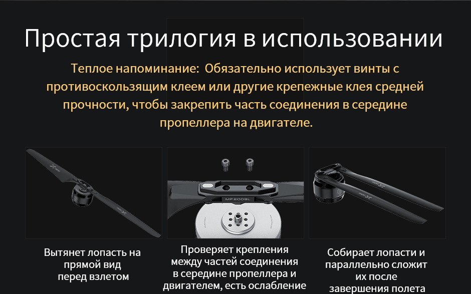 (2 )Пpоверьте повреждение пропеллера из полимера или нет перед взлетом аппаратасли имеется поврежде ние, замените его вовремя,в противном слуЧае имеет скрыту опасность поломки.