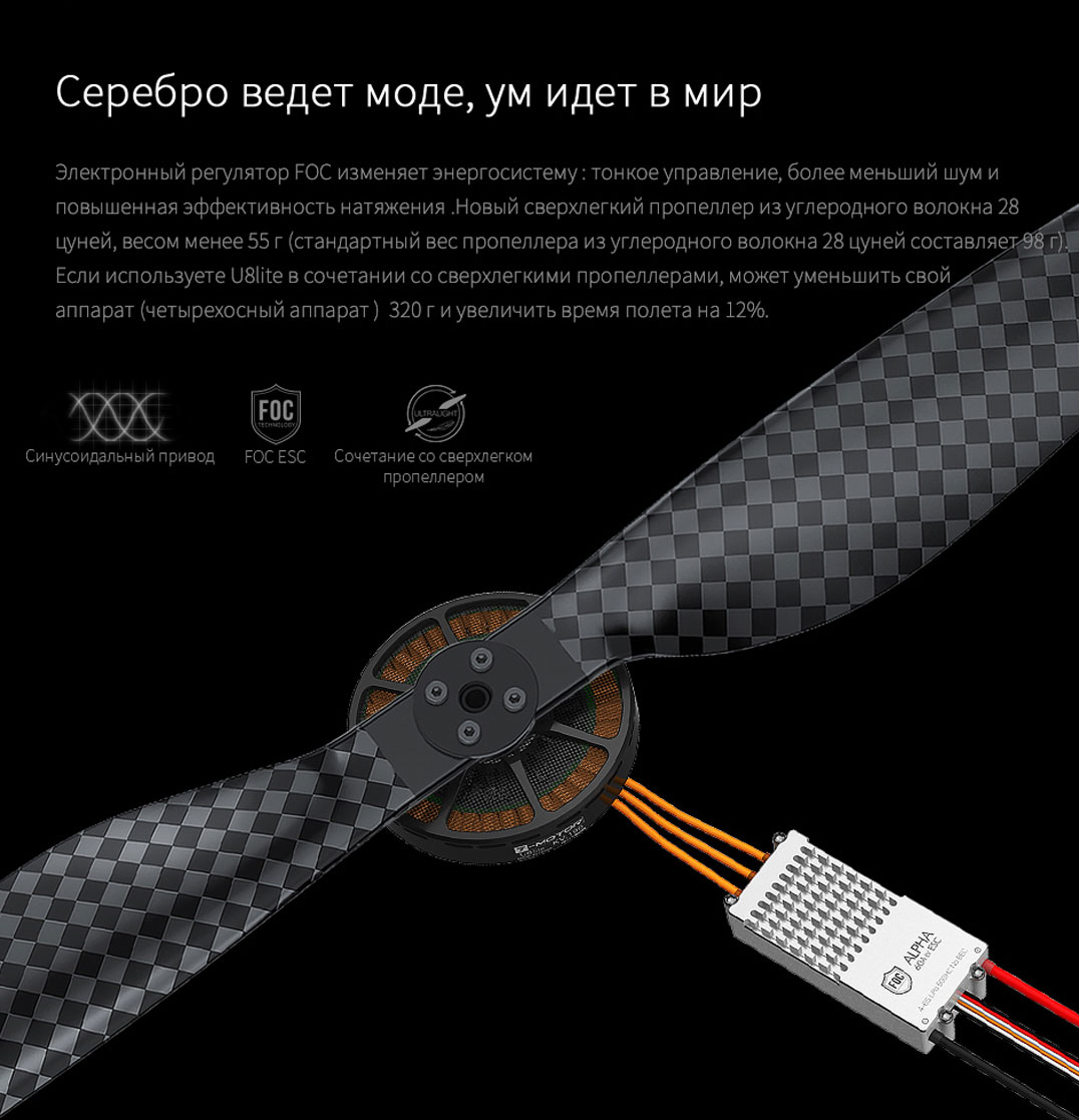 U8lite KV85 | 12S (48V) | T-MOTOR G28*9.2” CF | 40% | 1465 | 0.45 | 1.80 | 1584 | 86 | 16.96 | 88 (температура окружающей среды: 26.9℃) |